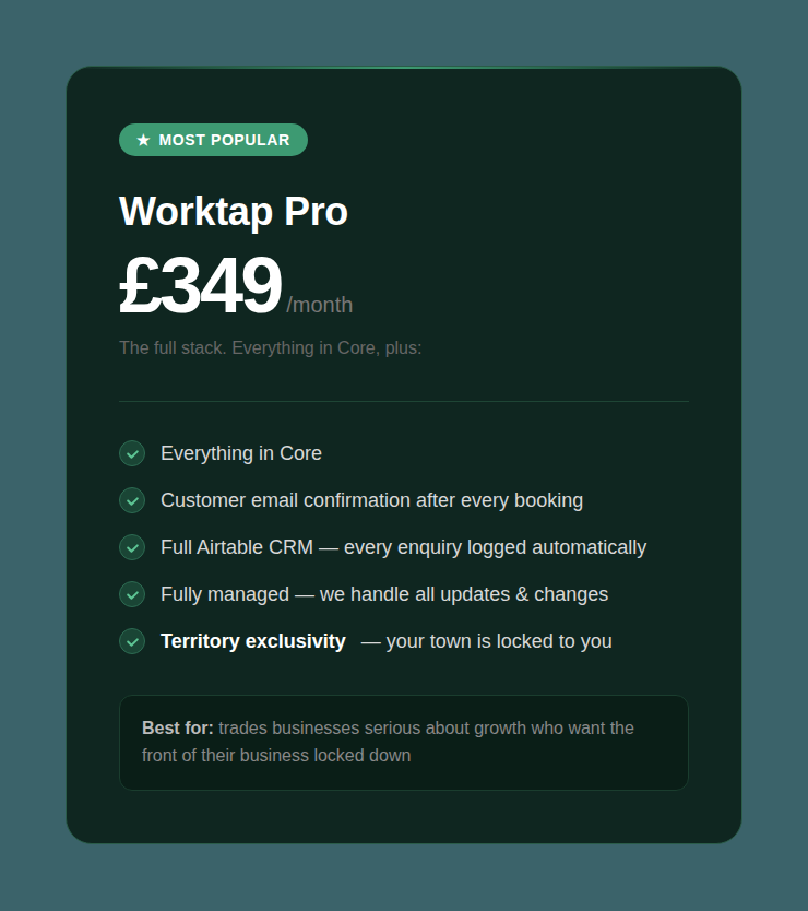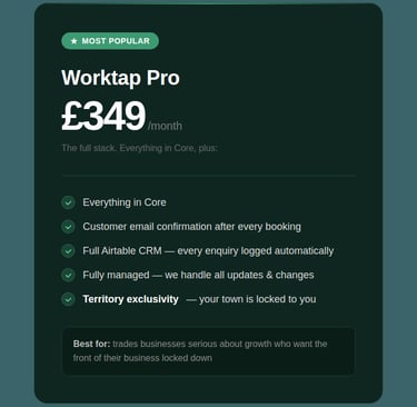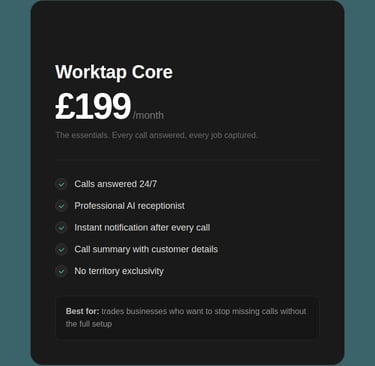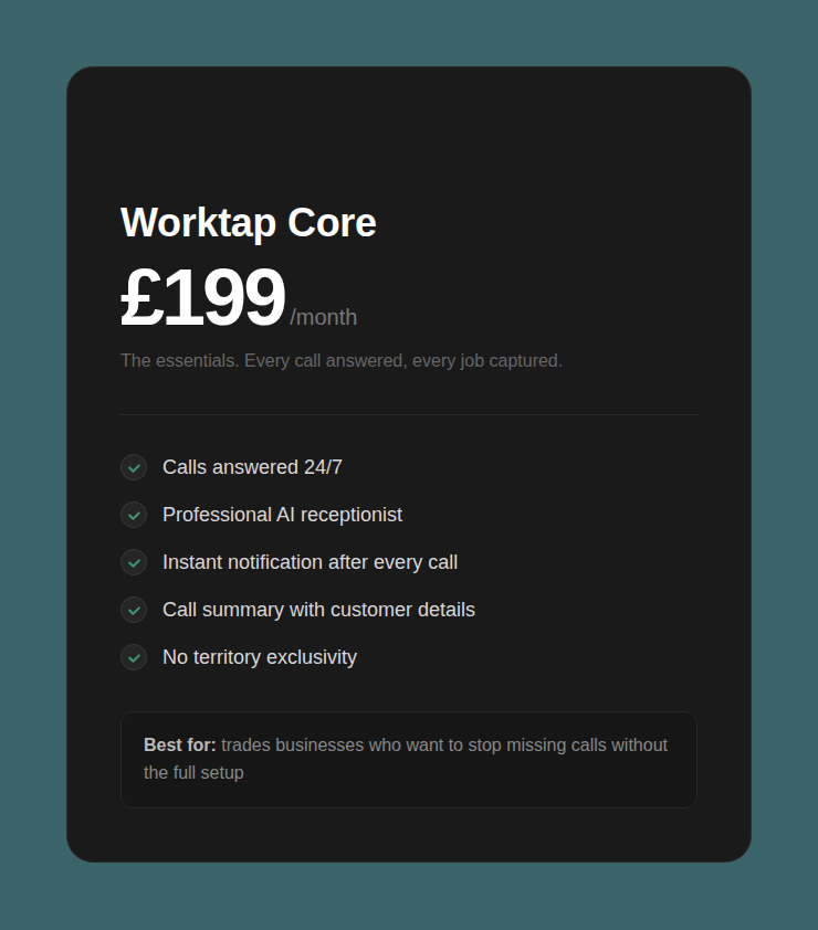 Worktap answers your calls, qualifies the job and books it in — while you're under a sink. Fully managed. No staff. No tech headaches. From £199/month.